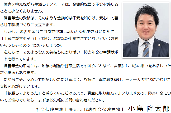 障害年金は、まさにそのような状況にある方々の生活を安定させて、今後も安心して暮らしていくことができるように設けられた制度です。